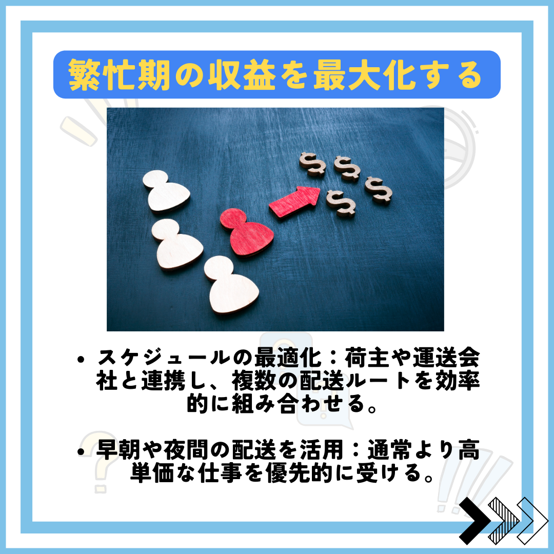 • 高単価の仕事を優先:早朝や夜間の配送は、通常より高単価で依頼されることが多いため、優先的に受注することで収益をさらに伸ばせます。さらに、リピーターの顧客や継続的な契約案件を確保することで、安定的に高単価の案件を取り込めます。